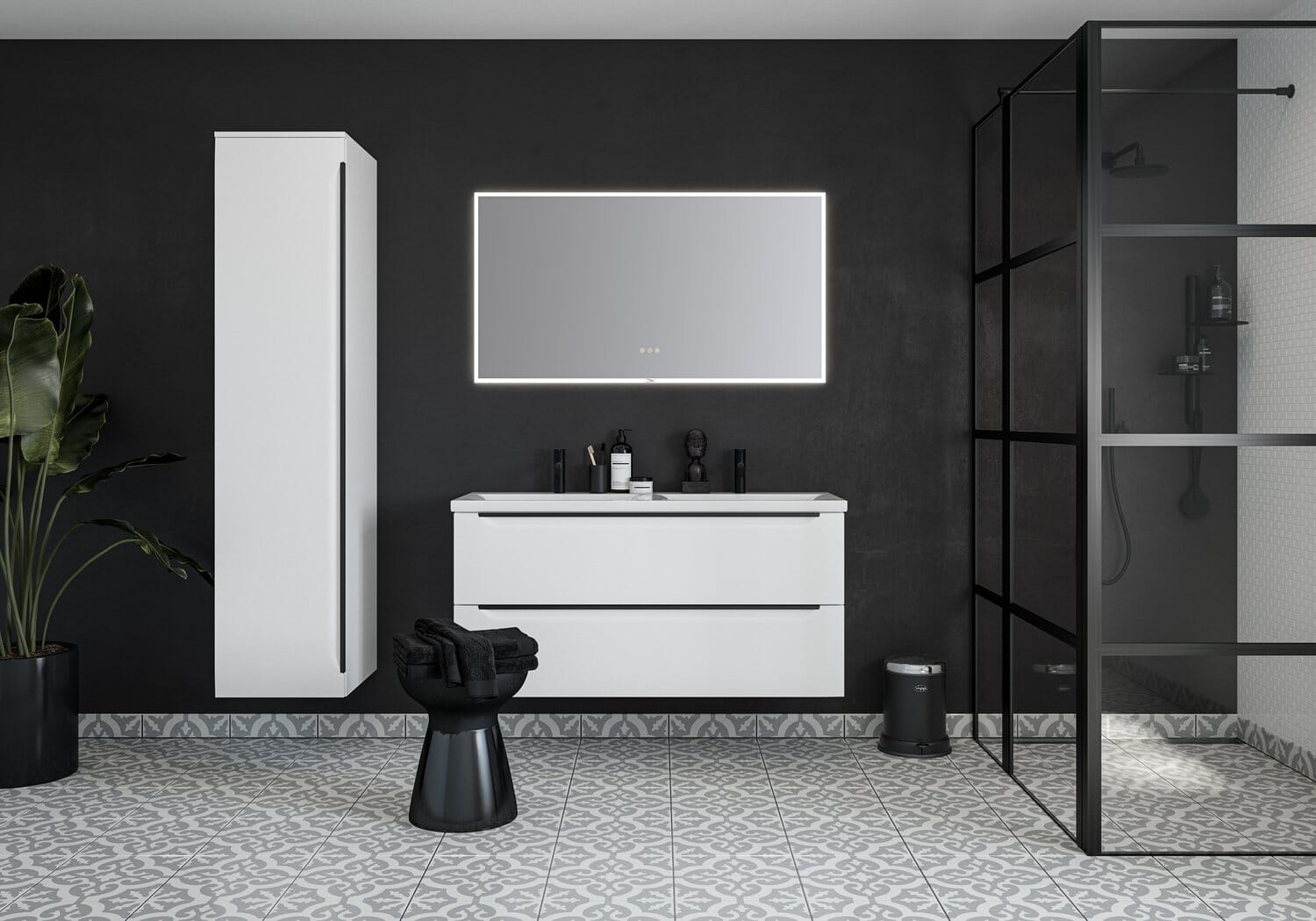120cm servantskap med sort grep, speil og høyskap hvit høygl