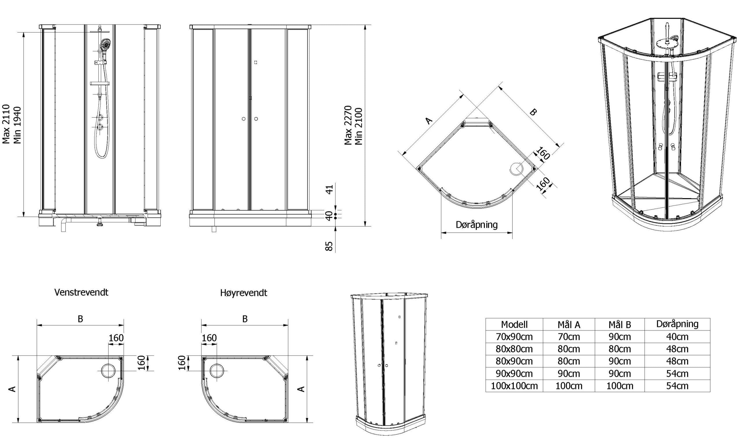 - 100×100×210 cm – romslig kabinett med lavt innsteg.