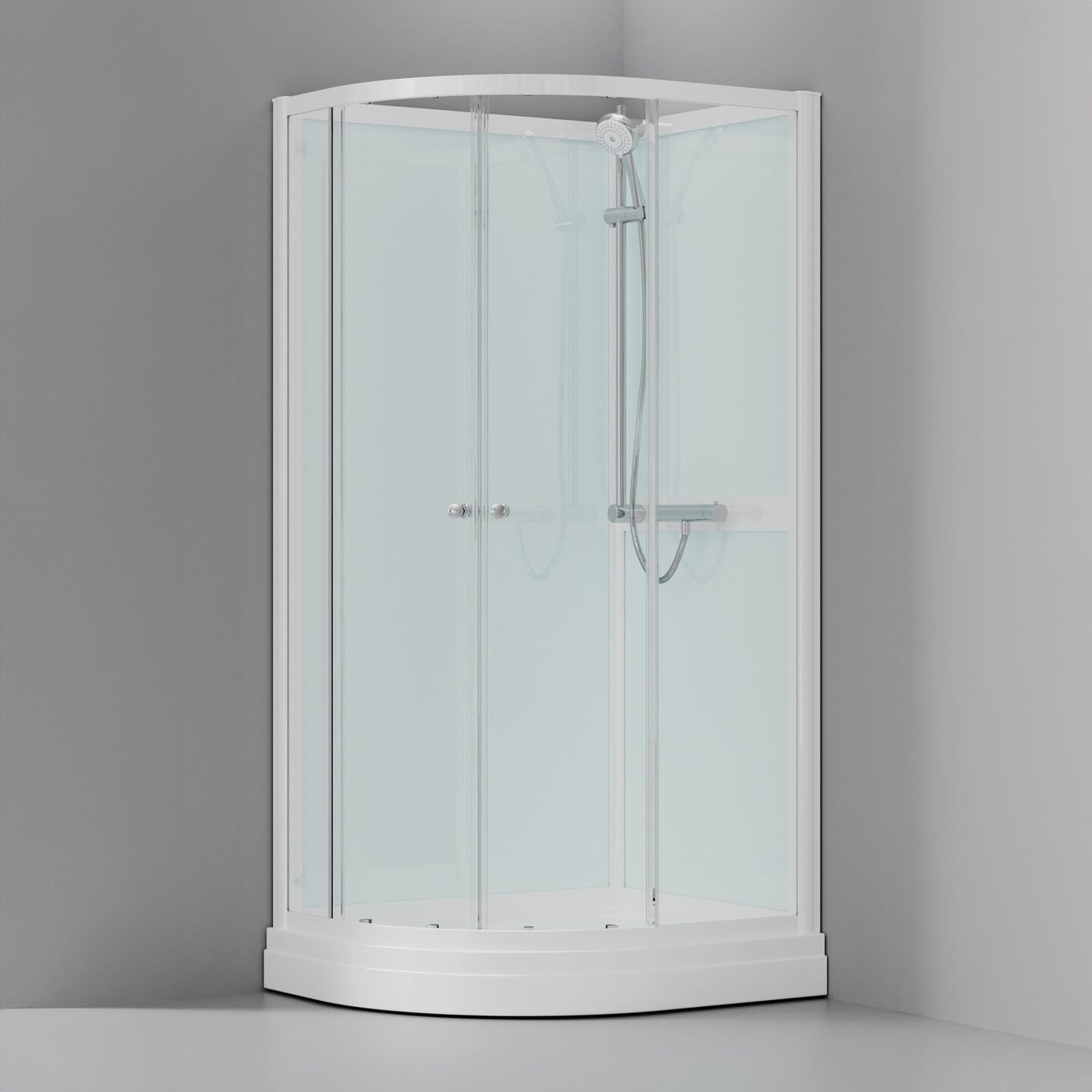 Den buede fronten gir god albuerom i dusjen, mens hvite bakvegger og lukket bunnkar beskytter vegger og gulv – perfekt der du ikke vil flislegge hele dusjsonen.