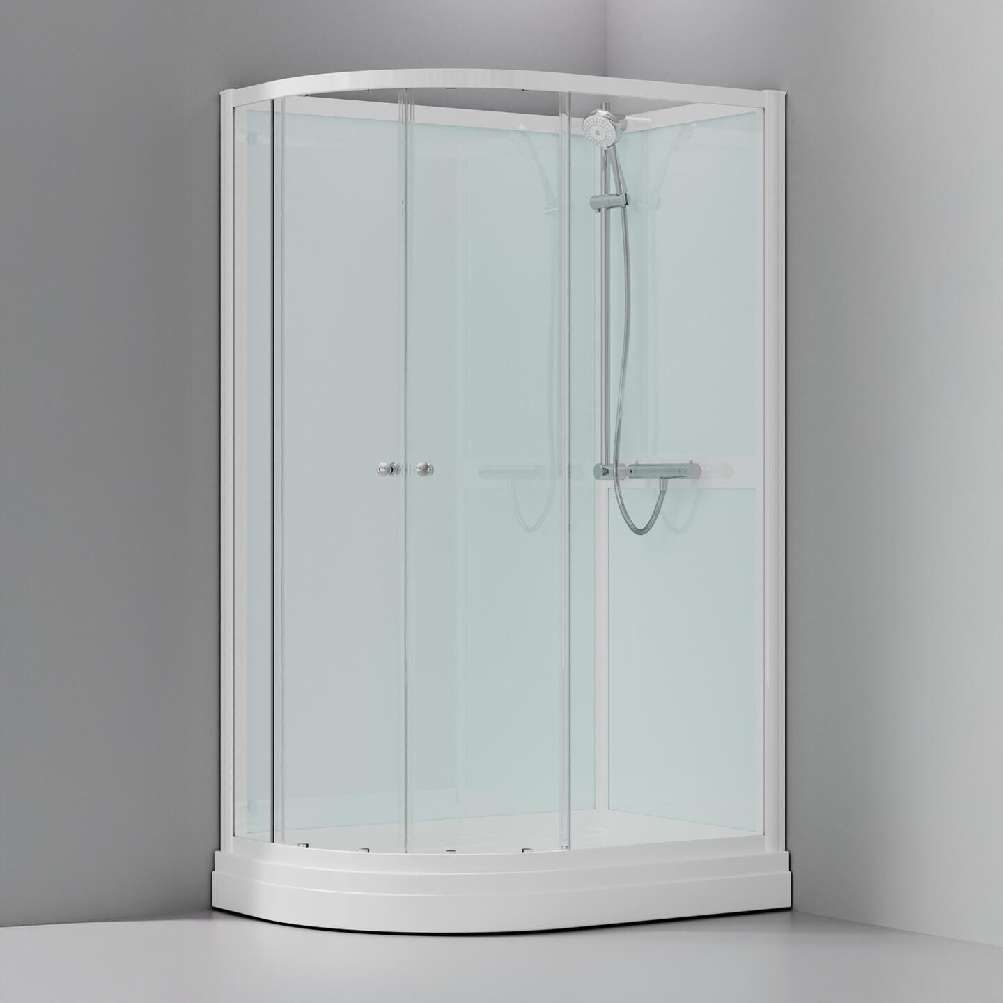 Den buede fronten gir god albuerom i dusjen, mens hvite bakvegger og lukket bunnkar beskytter vegger og gulv – perfekt der du ikke vil flislegge hele dusjsonen.