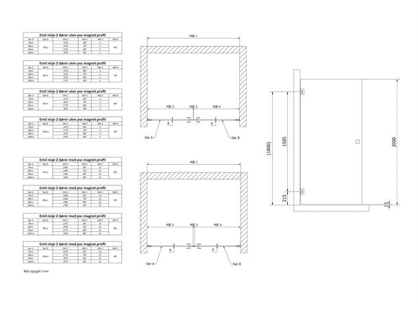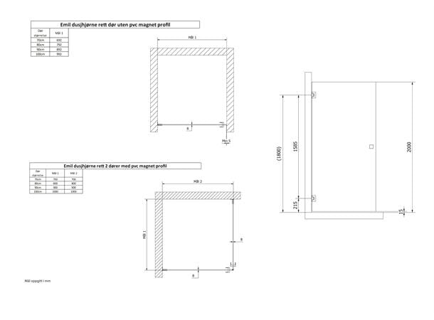Emil dusj har begrenset justeringsmuligheter mot vegg, men vil alltid kunne monteres så sant veggens toleranseklasse er i henhold til normalkrav for innervegger angitt i NS3420-1 (3mm helling pr høydemeter). Målene er oppgitt i ytterkant glass.