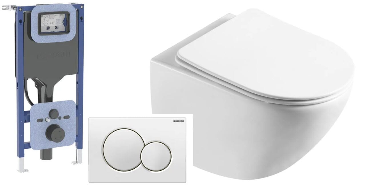Geberit Sawa veggstativ inkludert trykk knapp og Omea veggskål med sete.