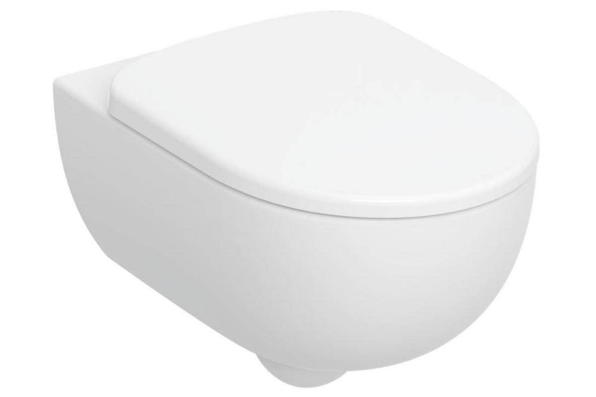 Vegghent toalett med skjult innfesting, Rimfree. Toalettsete i hvit hardplast, SoftClose og med QuickRelease.