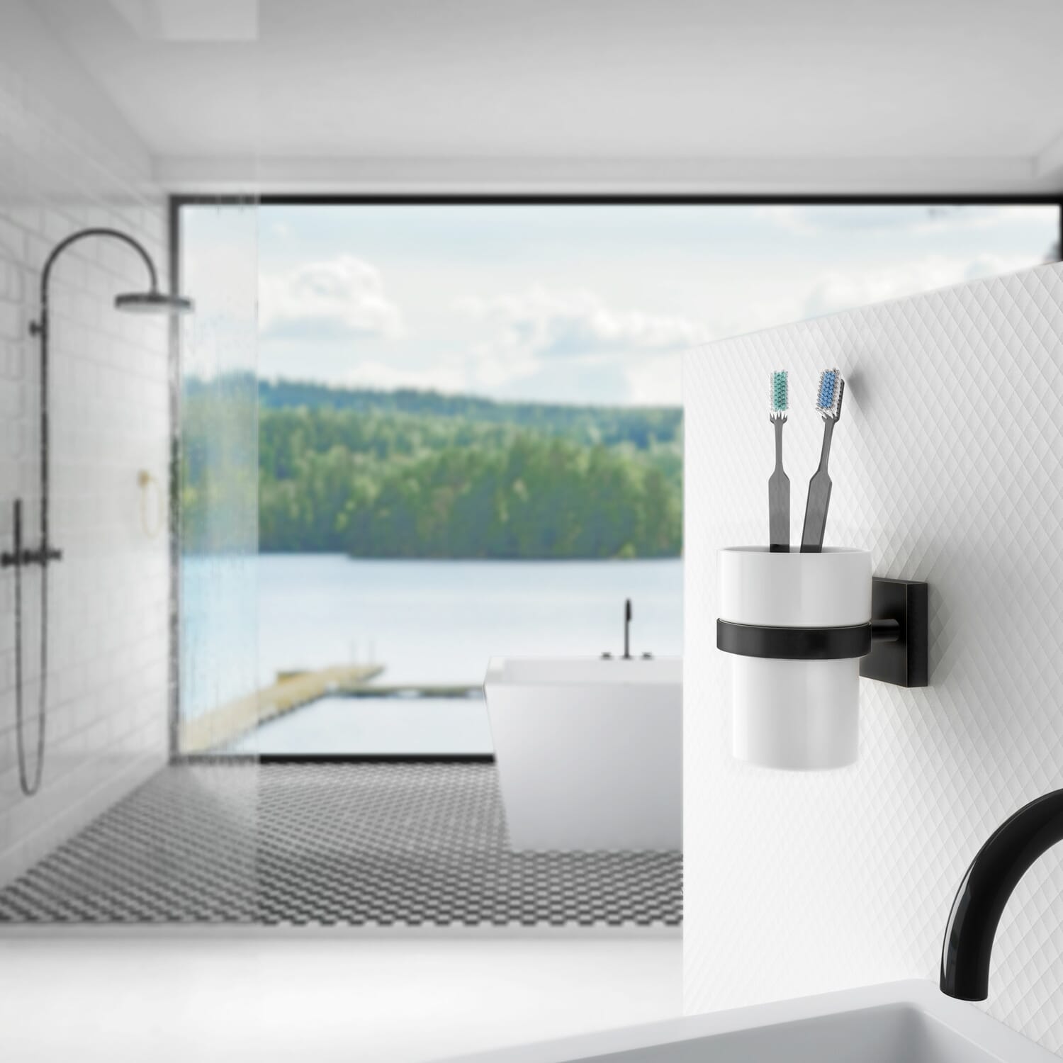 HOUSE holder med tannglass i porselen. Holder i matt sort. Skjult innfestning. Høyde 98 mm.