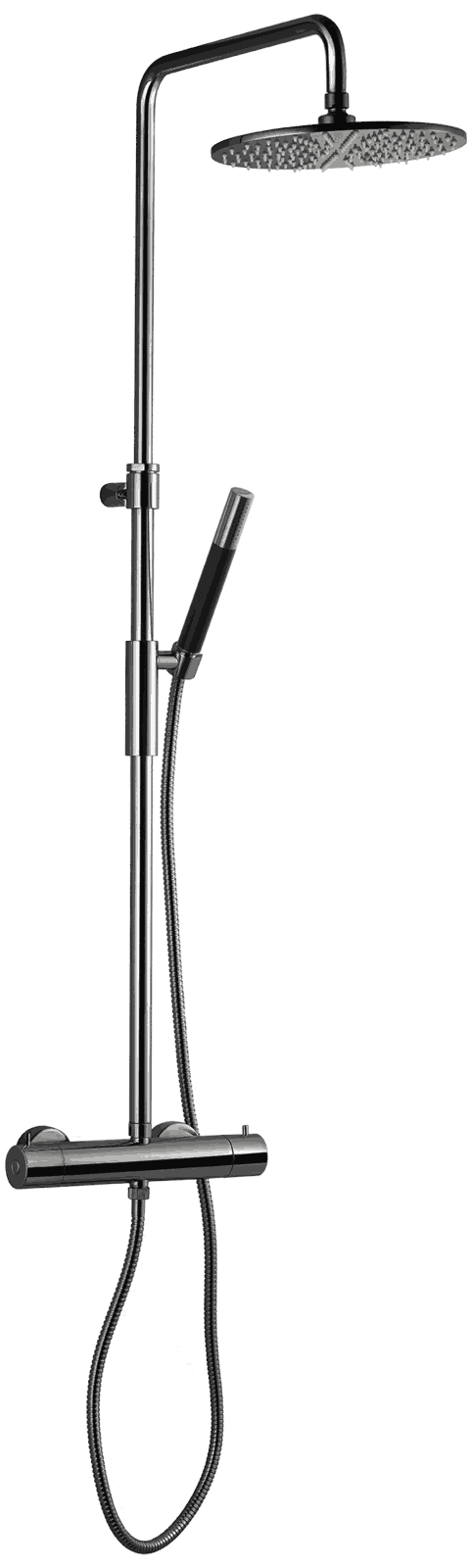Takdusj med trykk- og termostatstyrt dusjbatteri. Teleskopstang for enkel høydetilpasning av taksilen.