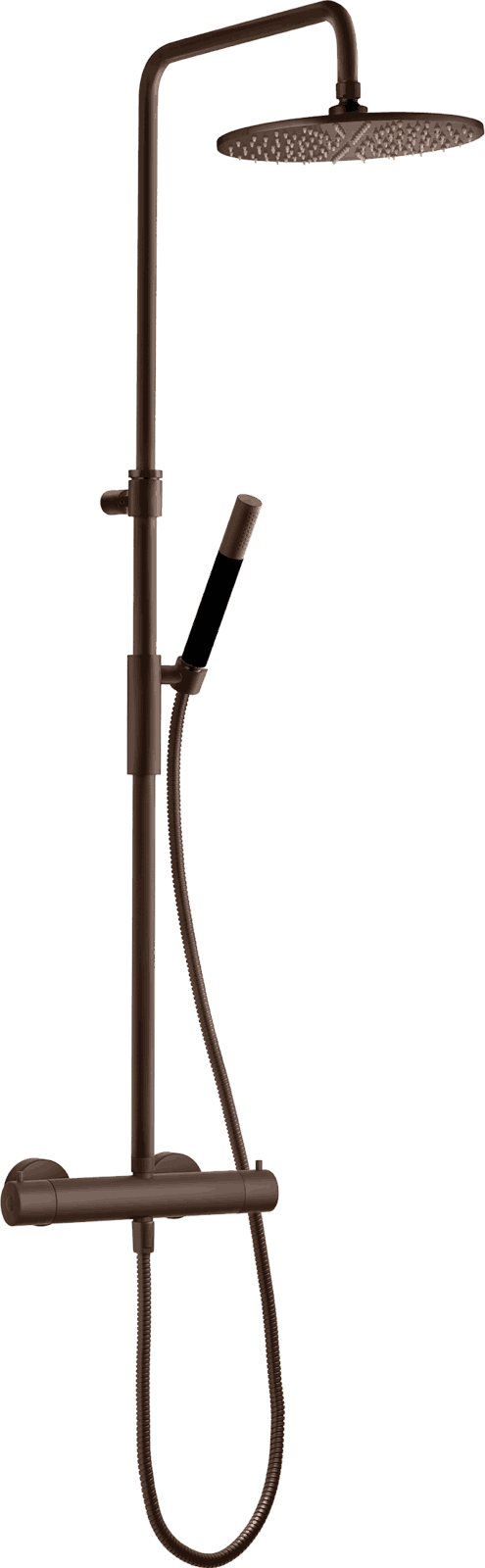 Takdusj med trykk- og termostatstyrt dusjbatteri. Teleskopstang for enkel høydetilpasning av taksilen.
