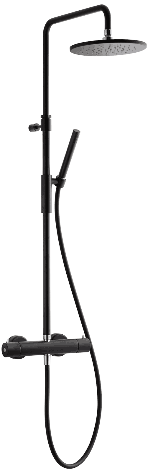 Takdusj med trykk- og termostatstyrt dusjbatteri. Teleskopstang for enkel høydetilpasning av taksilen.