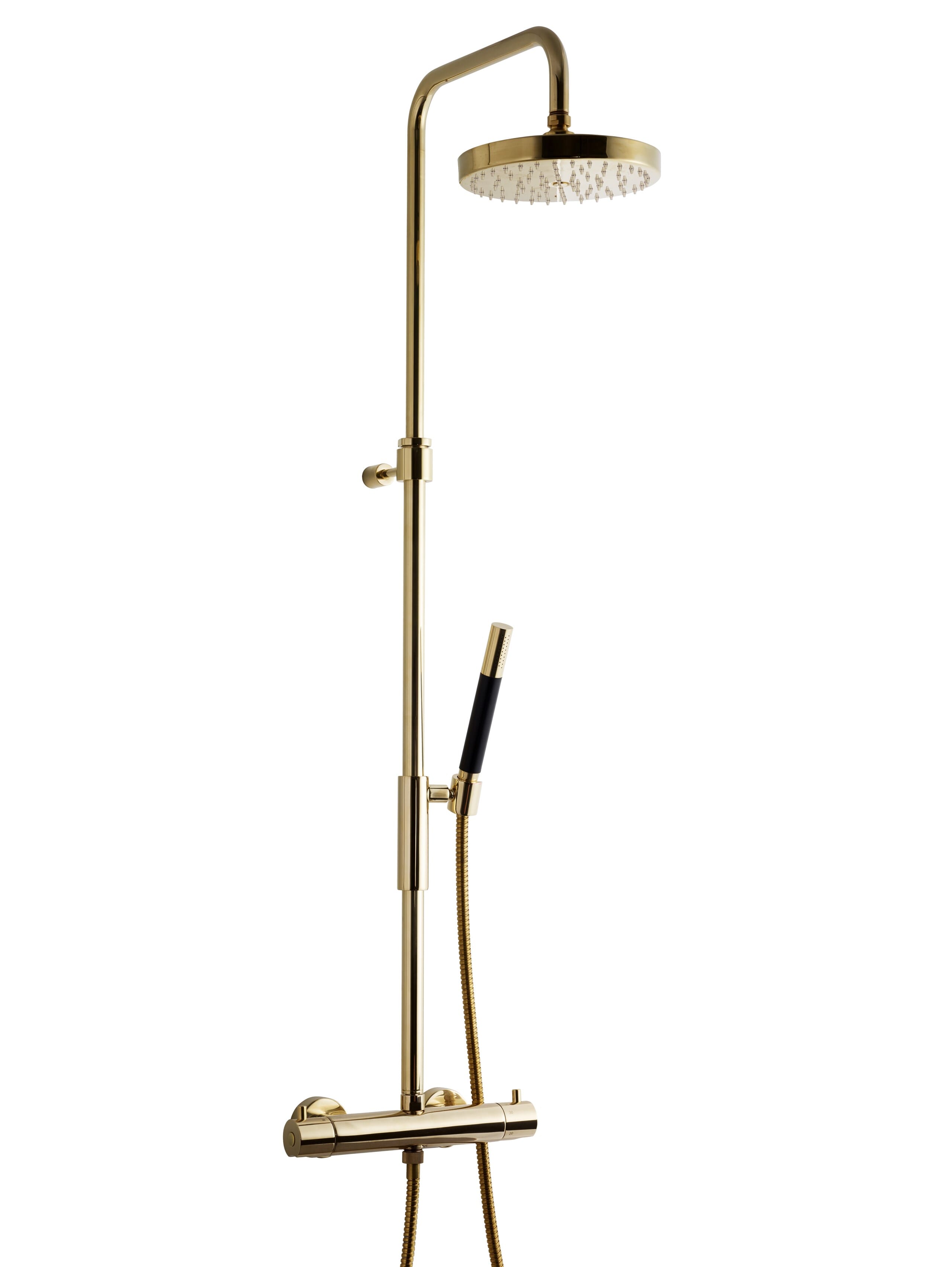Takdusj med trykk- og termostatstyrt dusjbatteri. Teleskopstang for enkel høydetilpasning av taksilen.
