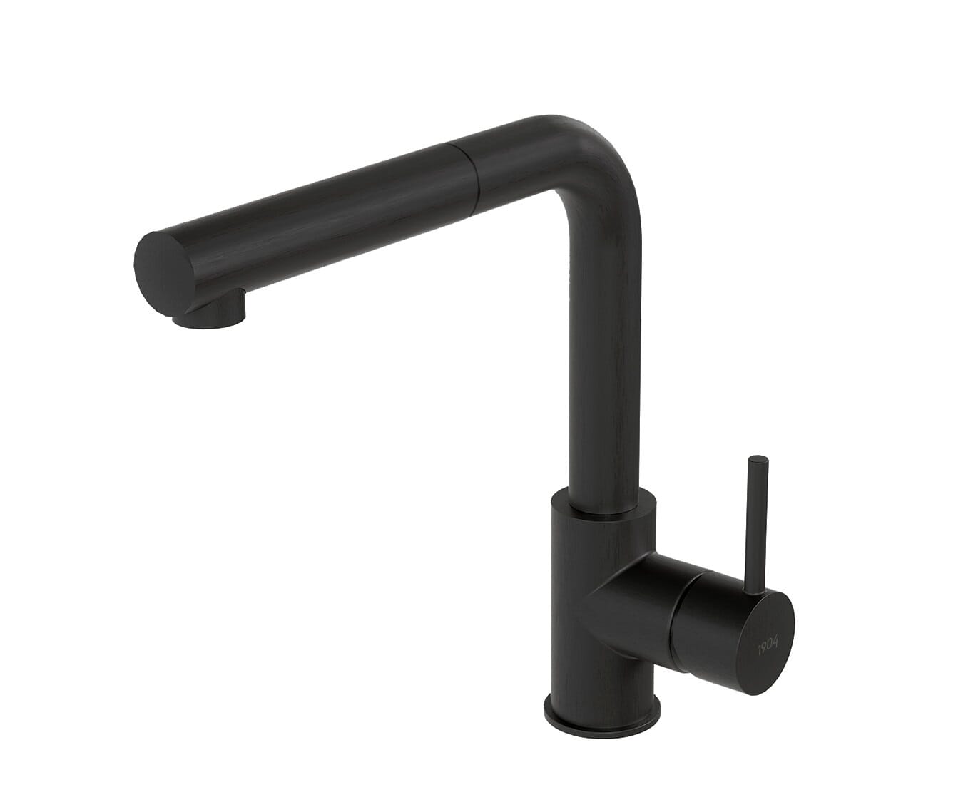 Kjøkkenbatteri med uttrekkbar hånddusj i sort matt utførelse.