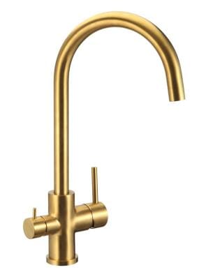 Kjøkkenbatteri i børstet gull med høy U-tut.