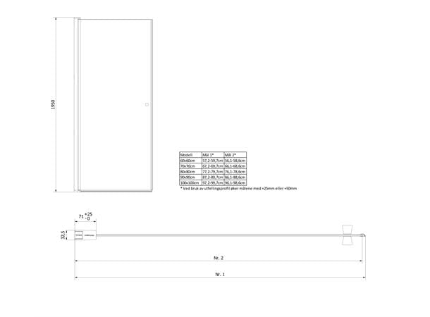 Rett dusjvegg sort matt profil og klart glass, 60cm.