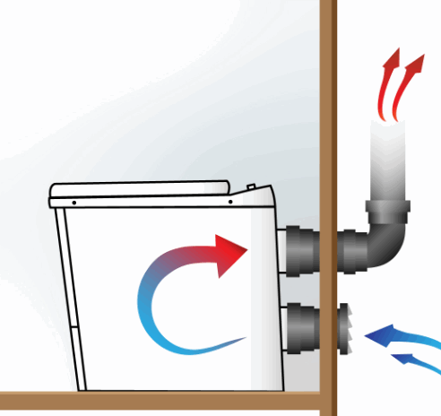 Toalettet er utstyrt med en egen kanal for til-luft til forbrenningskammeret slik at frisk luft trekkes fra utsiden av toalettet rommet.