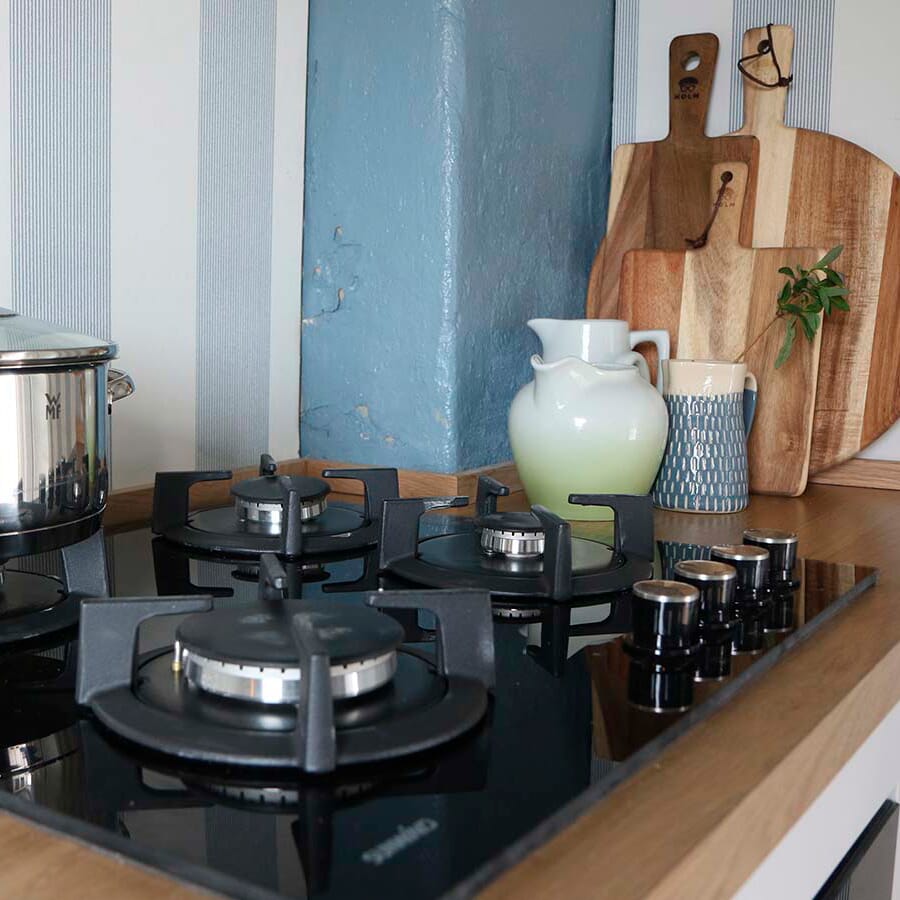 Praktisk og smakfullt design av kjeleholderne som ligger over hvert enkelt gassbluss.
