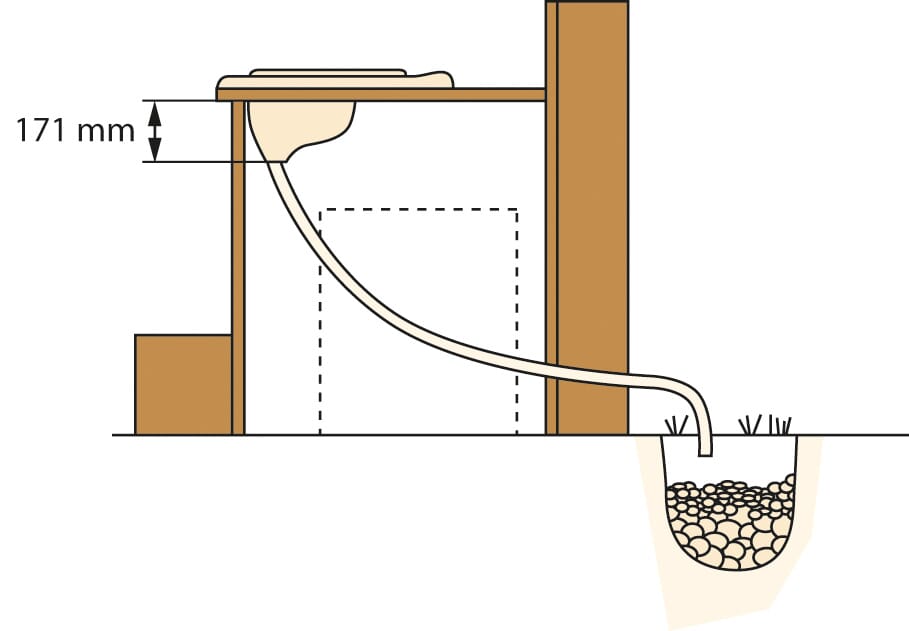 Urinen ledes bort med slange for infiltrasjon i bakken eller til oppbevaring i tank.