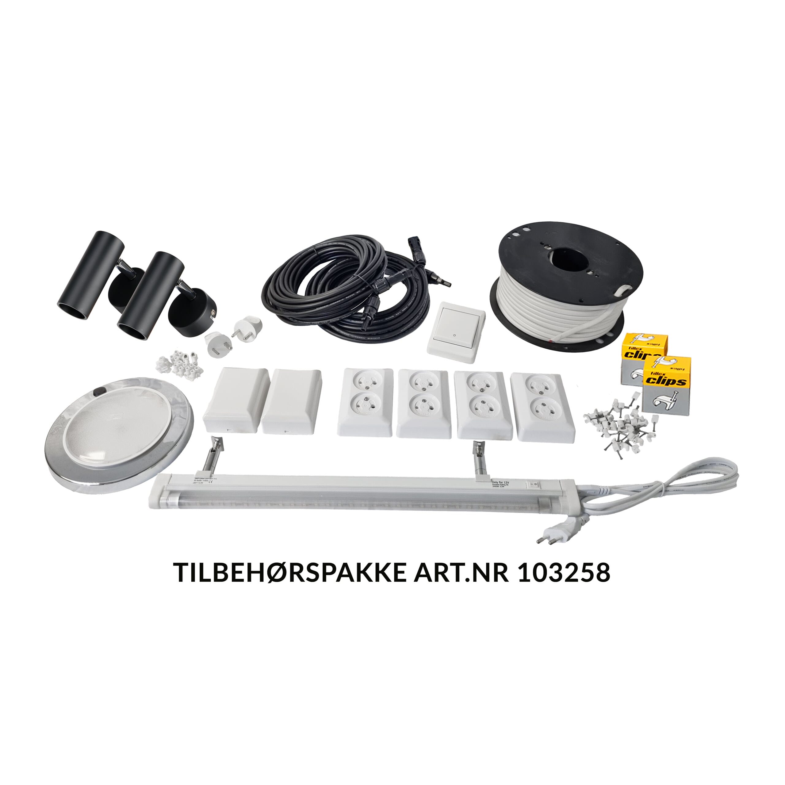 - Tilbehørspakke med kabler, koblingsutstyr, stikkontakter, bryter og belysning