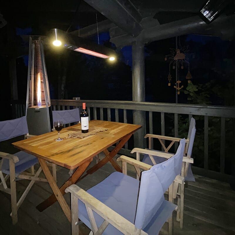 Lekker, elektrisk terrassevarmer i sort utførelse for montering i tak. Forleng sommerkvelden med vår slim-line terrassevarmer. Ved å henge terrassevarmeren midt over et bord, vil alle som sitter rundt den få glede av den. Med innebygde led-lys.