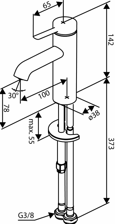 - Mål (fra dimensjonstegning): høyde ca. 142 mm, utstikk ca. 100 mm, fot Ø38 mm,