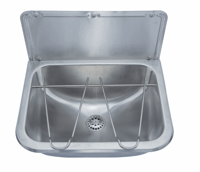 Utslagsvask i rustfritt stål. Inklusiv sprutplate, faste konsoller, bøtterist og bunnventil.