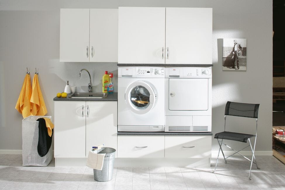 Skapene leveres i ulike størrelser og med praktiske løsninger som innebygd strykebrett, skuff under vaskemaskin, kosteskap - løsninger som gjør klesvasken til en lek !